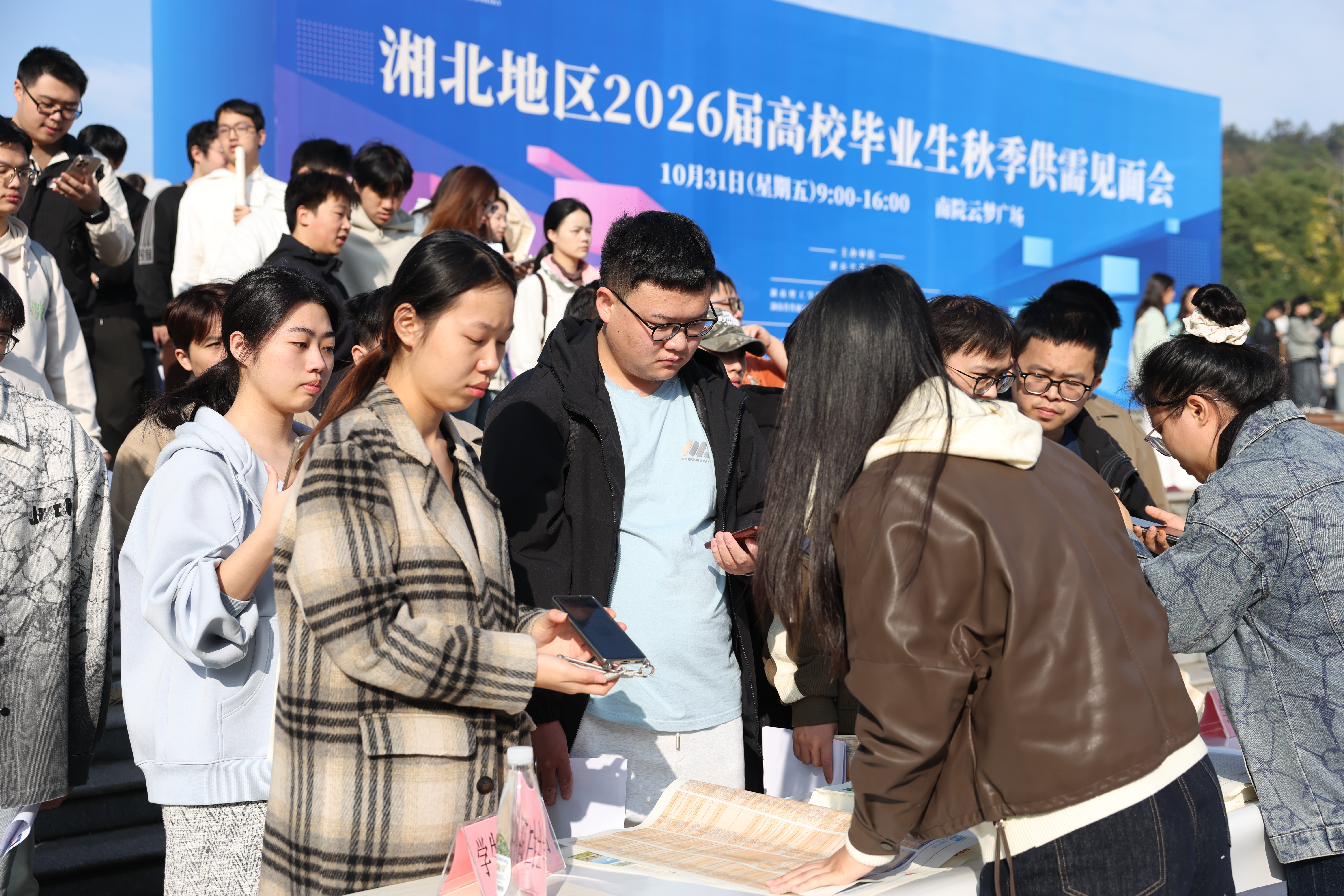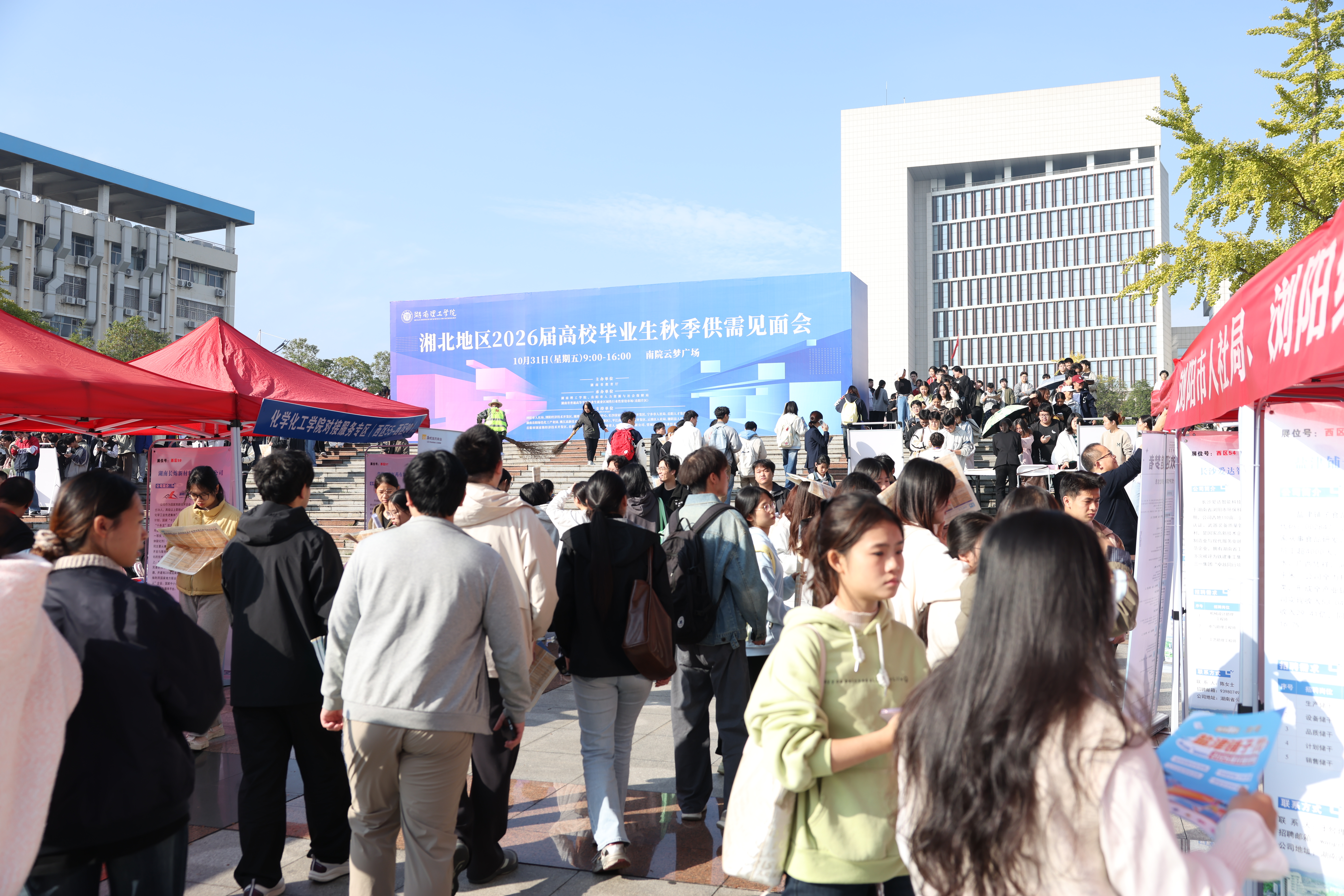 校园网讯 10月31日,湘北地区2026届高校毕业生秋季供需见面会在学校云梦广场举行。本次招聘会吸引了326家省内外企事业单位参与,涵盖制造业、教育业、信息传输、软件和信息技术服务业、建筑业等多个专业领域,为学校毕业生提供了多元化的就业选择。