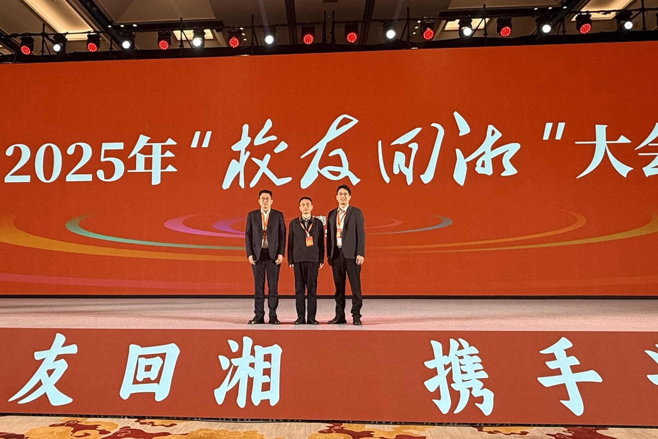 校园网讯 12月2日,2025年“校友回湘”大会在长沙举行。千余名湖湘校友欢聚湘水之畔,聚湖湘校友合力,绘三湘振兴蓝图。学校党委书记张国云出席,广东美尼能源有限公司董事长、化工学院校友卢灿生,华商律师事务所党委书记、法学院校友曾铁山,广东华峪实业发展有限公司董事长、土建学院校友周贤斌三位校友参加本次大会。